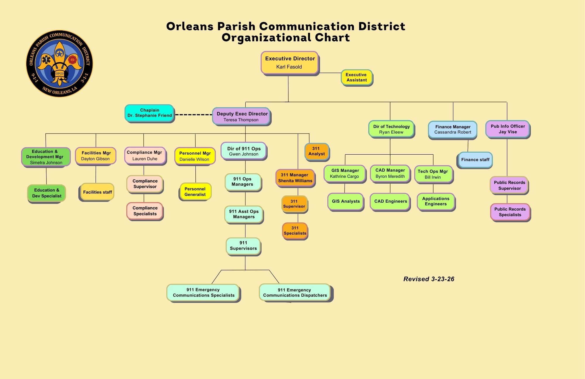 Before assuming the chief leadership role of the Orleans Parish Communications District, Executive Director Karl Fasold’s work at the OPCD stretched back more than two decades. In his various technology roles since 2004, culminating as OPCD Director of Technology 2023, Karl served under four previous Executive Directors. Among the many major projects he directed, he and his team oversaw the rebuilding of the New Orleans 9-1-1 system following Hurricane Katrina.